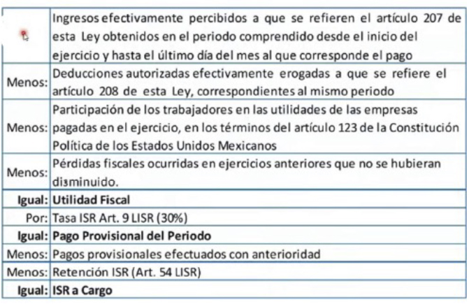 Para el calculo del pago de impuesto Provisional en cuestión del ISR, el método es distinto al que se contempla para las Personas morales del Régimen general, en este nuevo régimen para determinar la Utilidad fiscal se deberán restar al total de los ingresos efectivamente percibidos en el periodo comprendido desde el inicio del ejercicio y hasta el último día del mes al que corresponde el pago, las deducciones autorizadas efectivamente erogadas, correspondientes al mismo periodo y la participación de los trabajadores en las utilidades de las empresas pagadas en el ejercicio, y, en su caso, las pérdidas fiscales ocurridas en ejercicios anteriores que no se hubieran disminuido y, al ISR que se determine, se le podrán acreditar los pagos provisionales del mismo ejercicio efectuados con anterioridad, así como la retención que se le hubiera efectuado al contribuyente en el periodo, por instituciones que componen el sistema financiero y no se considera el coeficiente de utilidad, pero todavía se seguirá aplicando la tasa del 30% a la Utilidad que resulte en el ejercicio como se muestra a continuación: